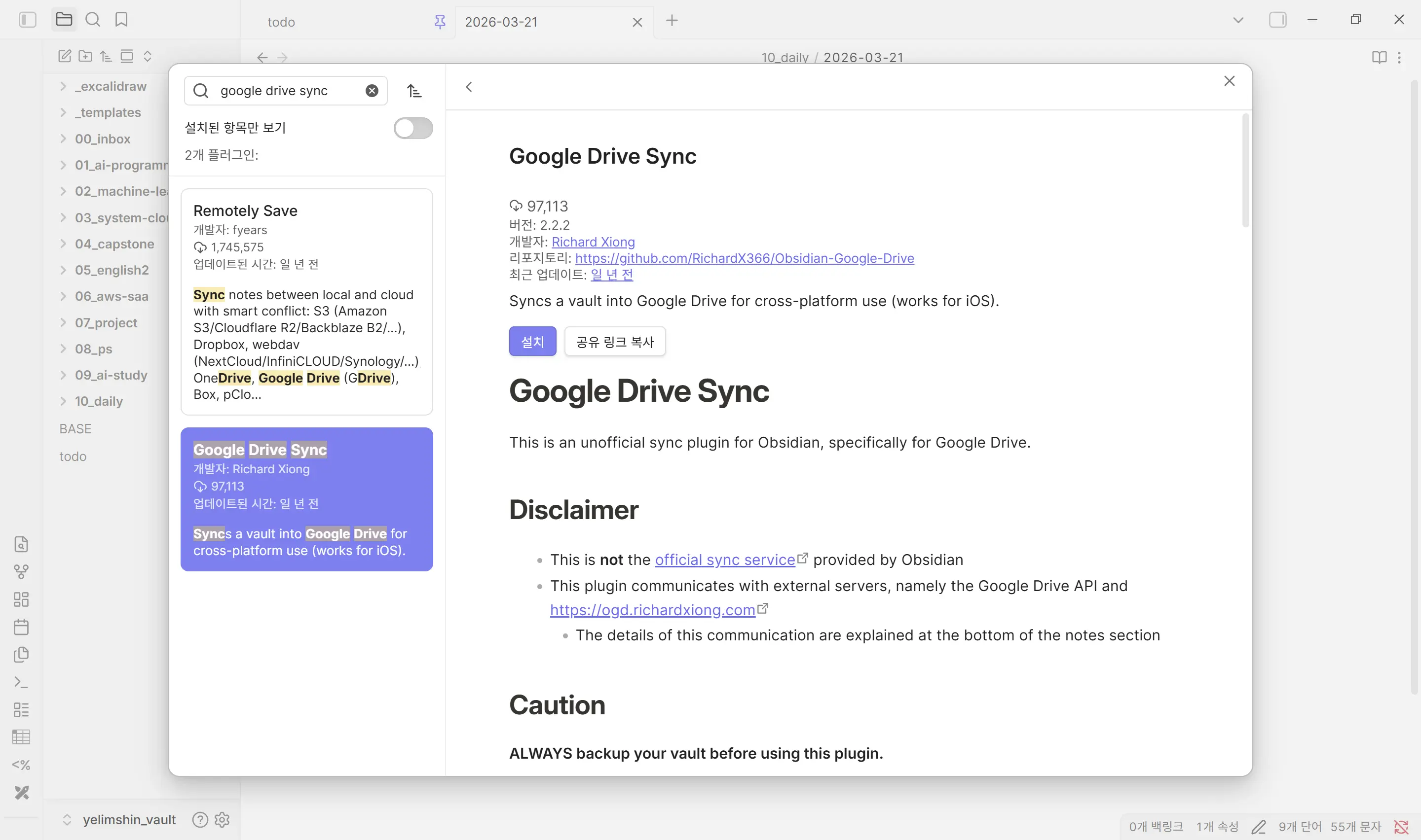 Obsidian에서는 커뮤니티 플러그인 항목에서 Google Drive Sync 검색 시 쉽게 설치할 수 있다